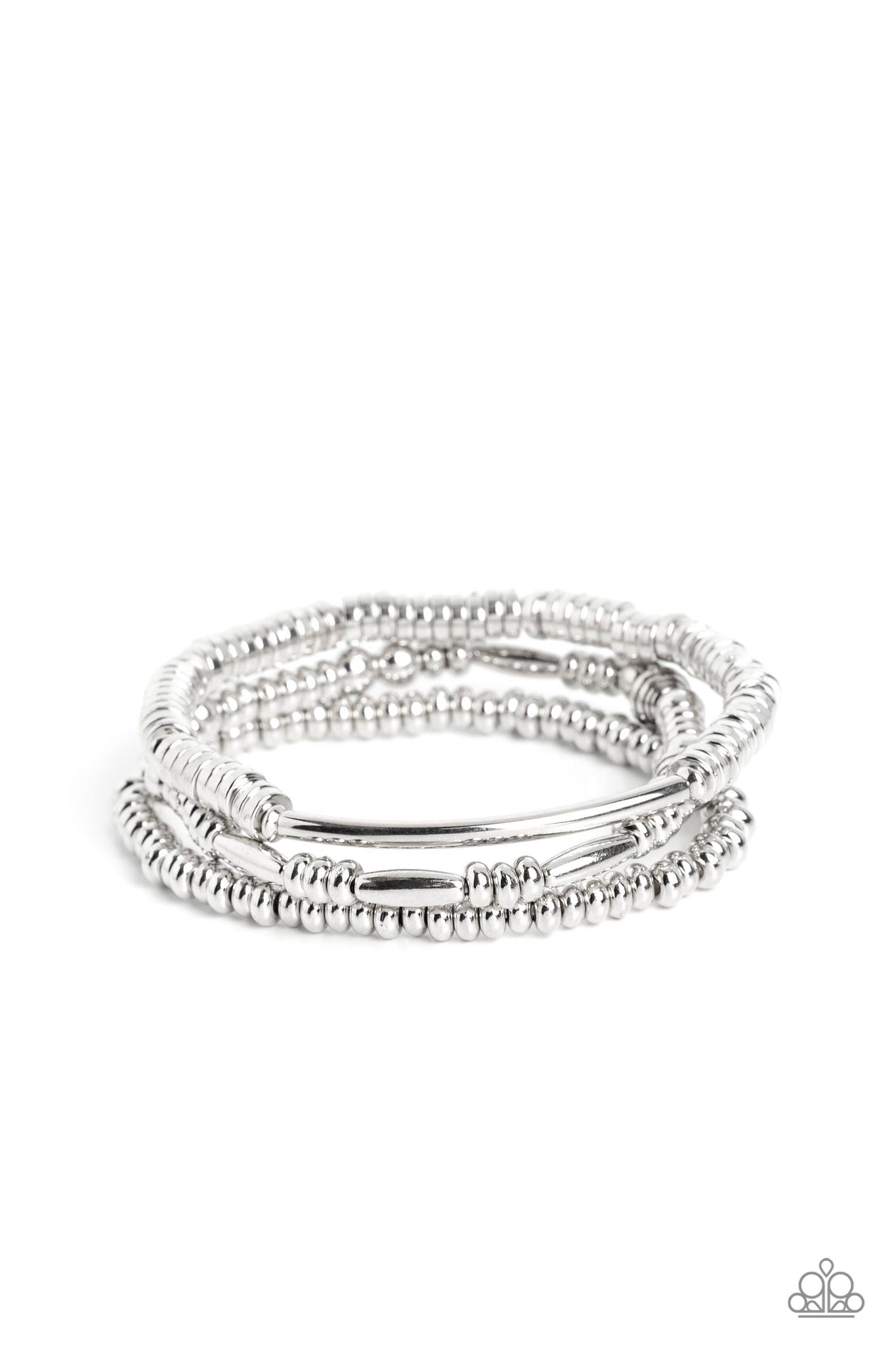 Silver beads, textured beads, cylindrical beads, discs, and curved overlays of silver wrap around the wrist on stretchy bands for a high-sheen, monochromatic stack.